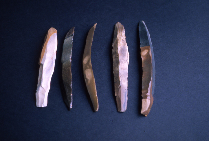 Parmi les découvertes emblématiques, cinq grandes lames de silex (silex bergeraquois), elles aussi cachées avec soin, témoignent du savoir-faire et des échanges.