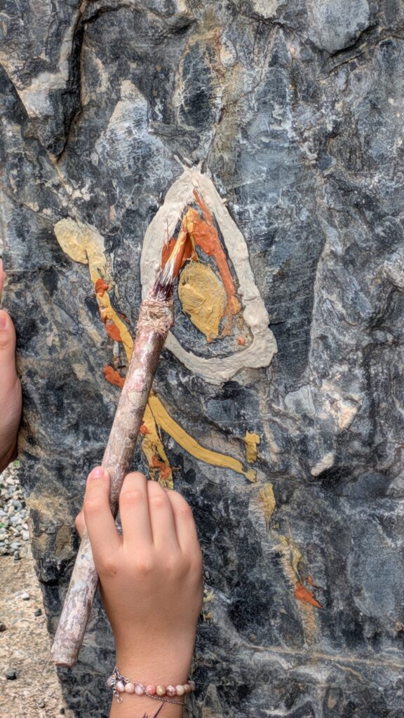 Ici, pas de feutres ni de peinture en tube, mais des pigments naturels comme l’ocre, le charbon ou l’argile, appliqués à l’aide des doigts, de bâtons, de plumes ou de pinceaux rustiques. On explore, on teste, on apprend et surtout on s’amuse !