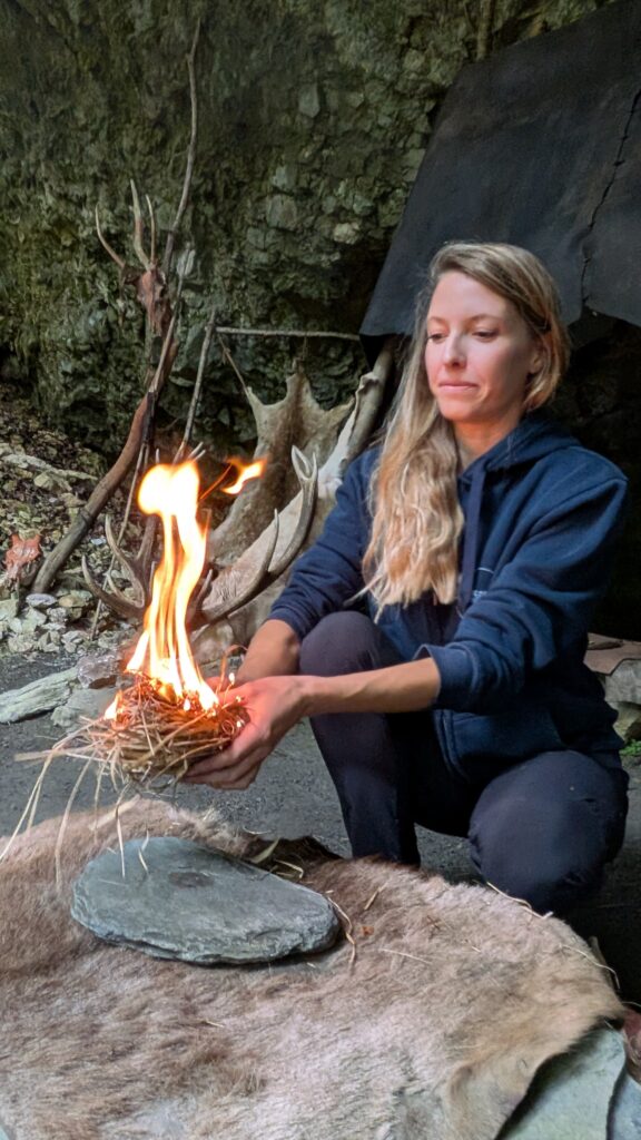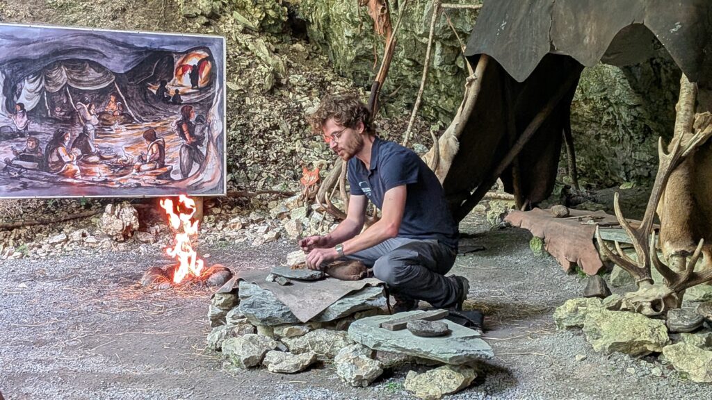 Moment fort de la visite, l’atelier du feu préhistorique vous transporte à une époque où allumer une flamme relevait du défi quotidien. Grâce à une démonstration captivante, nos guides vous montrent en direct comment les hommes du Paléolithique parvenaient à produire du feu, sans briquet ni allumettes, à partir de matériaux naturels et de gestes ancestraux.