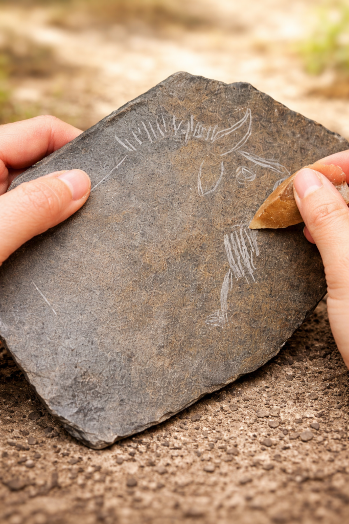 Sur des rochers ou des plaques de pierre, chacun peut dessiner des mains, des animaux, des symboles ou des formes géométriques, en s’inspirant des véritables œuvres retrouvées dans des grottes célèbres comme Lascaux, Chauvet, Gargas ou bien-sûr Labastide.